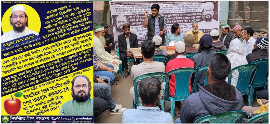এয়োদশ রাষ্ট্রীয় সংসদ নির্বাচনে মানবতার রাজনীতির প্রবর্তক আল্লামা ইমাম হায়াত প্রতিষ্ঠিত বিশ্ব ইনসানিয়াত বিপ্লব বাংলাদেশ নারায়ণগঞ্জ-১(রূপগঞ্জ) আসনে মনোনীত এমপি পদপ্রার্থী শেখ রায়হান রাহবার ভাইয়ের পক্ষে নির্বাচনী প্রচারনা।