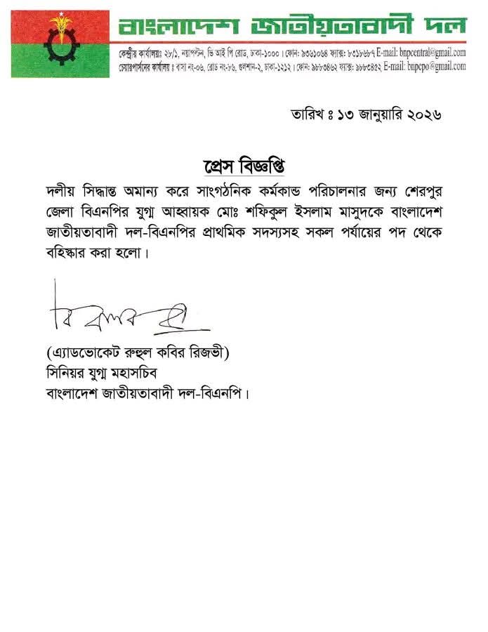 বিজ্ঞপ্তিতে বলা হয়, দলীয় সিদ্ধান্ত অমান্য করে সাংগঠনিক শৃঙ্খলা ভঙ্গ ও দলবিরোধী কর্মকাণ্ডে জড়িত থাকার কারণে শেরপুর জেলা বিএনপির যুগ্ম আহ্বায়ক মো. শফিকুল ইসলাম মাসুদকে বাংলাদেশ জাতীয়তাবাদী দল (বিএনপি)-এর প্রাথমিক সদস্যপদসহ সকল পর্যায়ের পদ থেকে বহিষ্কার করা হলো।