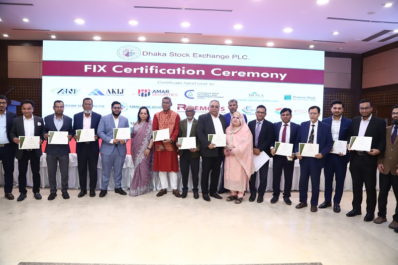 এপিআই সংযোগের মাধ্যমে নিজস্ব ওএমএস চালু করার লক্ষ্যে ঢাকা স্টক এক্সচেঞ্জ পিএলসি আরও ১১টি ব্রোকারেজ হাউসকে ফিক্স সার্টিফিকেশন প্রদান করেছে। প্রতিষ্ঠানগুলো হলো-এন এফ ম্যানেজমেন্ট কোম্পানি লি:, আকিজ ক্যাপিটাল ম্যানেজমেন্ট লি:, আমার সিকিউরিটিজ লি:, কমার্স ব্যাংক সিকিউরিটিজ অ্যান্ড ইনভেস্টমেন্ট লি:, মোনা ফিন্যান্সিয়াল কনসালটেন্সি অ্যান্ড সিকিউরিটিজ লি:, প্রিমিয়ার ব্যাংক সিকিউরিটিজ লি:, প্রাইলিঙ্ক সিকিউরিটিজ লি:, পূবালী ব্যাংক সিকিউরিটিজ লি:, রেমন্স ইনভেস্টমেন্ট অ্যান্ড সিকিউরিটিজ লি:, স্কাইলাইন সিকিউরিটিজ লি: এবং ইউনাইটেড সিকিউরিটিজ লি:। গতকাল ১১ মার্চ ২০২৬ তারিখে ডিএসই মাল্টিপারপাস হলে আয়োজিত এক অনুষ্ঠানে ডিএসই’র ব্যবস্থাপনা পরিচালক নুজহাত আনোয়ার ব্রোকারেজ হাউসগুলোকে ফিক্স সার্টিফিকেশন প্রদান করেন। এসময় উপস্থিত ছিলেন ডিএসই’র প্রধান পরিচালনা কর্মকর্তা মোহাম্মদ আসাদুর রহমান, এফসিএস; প্রধান প্রযুক্তি কর্মকর্তা ড. মোঃ আসিফুর রহমান; আইসিটি ডিভিশনের মহাব্যবস্থাপক মোঃ তারিকুল ইসলাম; উপ-মহাব্যবস্থাপক হাসানুল করিমসহ ডিএসই’র ঊর্ধ্বতন কর্মকর্তাবৃন্দ।